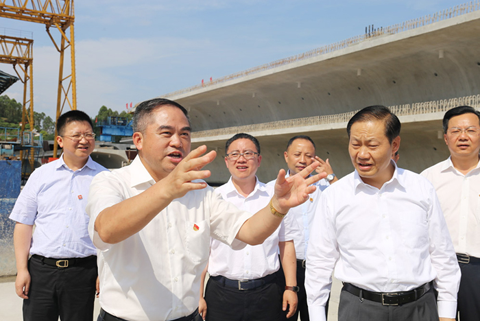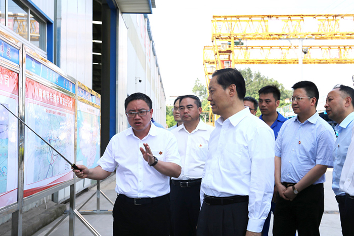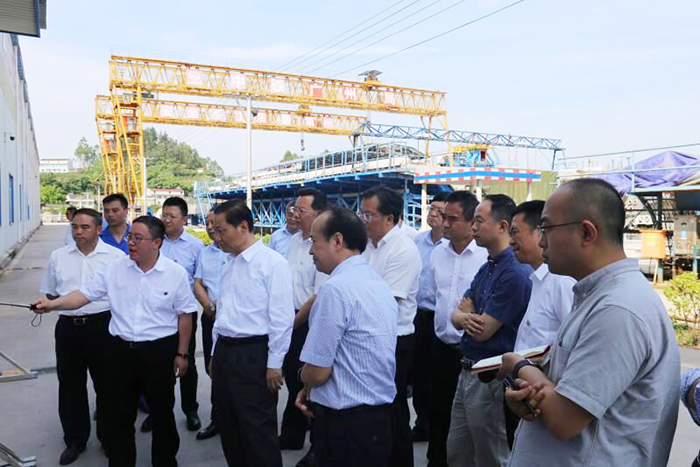 彭清華等領(lǐng)導一行實(shí)地察看了自貢制梁場(chǎng)施工現場(chǎng),唐云向彭清華等領(lǐng)導介紹了箱梁預制的工序工藝流程和箱梁架梁的“搬、提、運、架”施工流程,對中鐵廣州局為川南城際鐵路做出的貢獻表示贊賞,對中鐵廣州局主動(dòng)地融入四川、服務(wù)四川、建設四川,為推動(dòng)治蜀興川再上新臺階作出的貢獻表示感謝。彭清華說(shuō),當前四川省正處在轉型發(fā)展、創(chuàng )新發(fā)展、跨越發(fā)展的關(guān)鍵時(shí)期,中鐵廣州局川南城際項目部要搶抓機遇,以“主人翁”角色,自覺(jué)置身于四川經(jīng)濟社會(huì )發(fā)展大局,思考謀劃相關(guān)工作,要充分發(fā)揮中國中鐵作為中央企業(yè)的社會(huì )擔當精神,當好川南城際鐵路建設的排頭兵,干好現有工程,為進(jìn)一步完善四川鐵路交通網(wǎng)建設、提升四川鐵路樞紐地位做出積極貢獻。